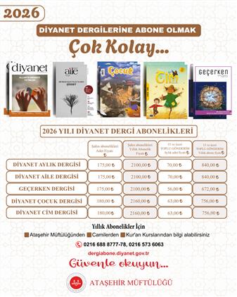 DİYANET DERGİLERİNE ABONE OLMAK ÇOK KOLAY... Yıllık Abonelikler İçin ✅Ataşehir Müftülüğünden ✅Camilerden ✅Kur'an Kurslarından bilgi alabilirsiniz.