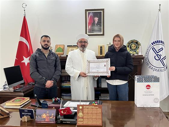 Müftü ÖZCAN tarafından mühtediye “İhtida Belgesi” takdim edildi. Ayrıca Diyanet İşleri Başkanlığı yayınlarından mealli Kur’an-ı Kerim, siyer ve ilmihal kitapları hediye edildi.