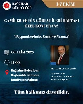 Mushafları İnceleme ve Kıraat Kurulu Başkanı Dr. Hafiz Osman ŞAHİN hocamızın katılımıyla düzenlenecek "Peygamberimiz, Cami ve Namaz" konulu konferansa tüm halkımız davetlidir.