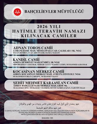 2026 yılında Bahçelievler Müftülüğü koordinesinde Hatimle Teravih heyecanı; Adnan Toros Camii, Kandil Camii, Kocasinan Merkez Camii ve Şehit Mehmet Karaaslan Camii’nde cemaatle buluşuyor. Bu mübarek Ramazan’da Teravih Namazı ve Ramazan Bereketi ile gönüller aynı safta, aynı hatimde birleşiyor. Ramazan 2026 boyunca Kur’an’ın nurunda buluşmak için tüm hemşehrilerimizi camilerimize bekliyoruz.