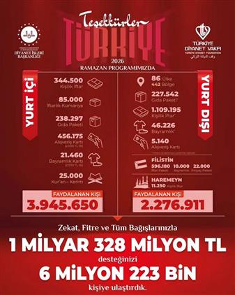 Diyanet İşleri Başkanlığı ile Türkiye Diyanet Vakfı, 2026 yılı Ramazan programı kapsamında yürüttüğü yurt içi ve yurt dışı yardım faaliyetleriyle milyonlarca ihtiyaç sahibine umut oldu. “Teşekkürler Türkiye” mesajıyla paylaşılan verilere göre, hayırsever vatandaşların zekât, fitre ve bağışlarıyla toplam 1 milyar 328 milyon TL tutarında destek ihtiyaç sahiplerine ulaştırıldı.