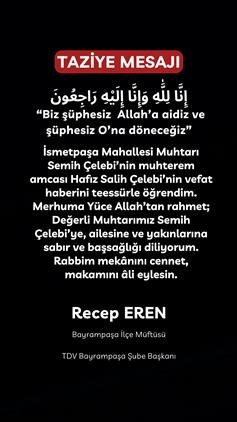 İsmetpaşa Mahallesi Muhtarı Semih Çelebi’nin muhterem amcası Hafız Salih Çelebi’nin vefat haberini teessürle öğrendim.Merhuma Yüce Allah’tan rahmet; Değerli Muhtarımız Semih Çelebi’ye, ailesine ve yakınlarına sabır ve başsağlığı diliyorum.Rabbim mekânını cennet, makamını âli eylesin.