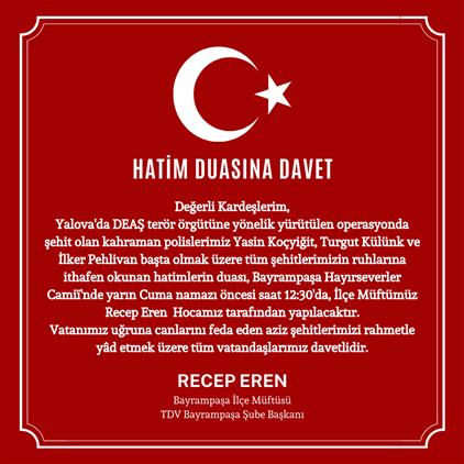 Yalova’da DEAŞ terör örgütüne yönelik yürütülen operasyonda şehit olan kahraman polislerimiz Yasin Koçyiğit, Turgut Külünk ve İlker Pehlivan başta olmak üzere tüm şehitlerimizin ruhlarına ithafen okunan hatimlerin duası, Bayrampaşa Hayırseverler Camii’nde yarın Cuma namazı öncesi saat 12.30’da, İlçe Müftümüz Recep Eren Hocamız tarafından yapılacaktır.