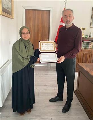Beylikdüzü İlçe Müftüsü Selami Sayın, Hacer Abdik Kız Kur’an Kursu Öğrencisi Elif Sude Ateş’e hafızlık belgesini takdim etti. İlçe Müftüsü Sayın, Kur’an hatmini bir günde tamamlayan öğrenciyi ve hocası Necmiye Kaya’yı tebrik ederek başarılarının devamını diledi.