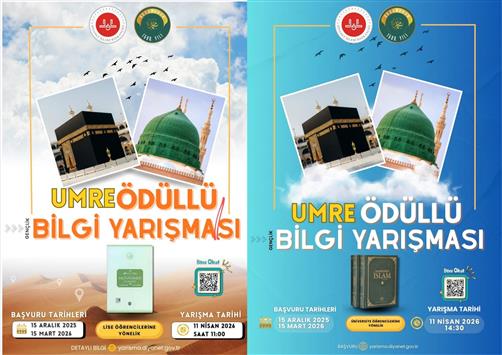 Umre Ödülü Bilgi Yarışması Son Başvuru Tarihi: 15 Mart 2026 Yarışma Tarihi: 11 Nisan 2026 Saat:11.00