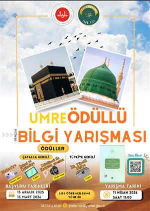 - 2026 Yılı Umre Ödüllü Gençlik Bilgi Yarışması 2025 yılı Mevlidi Nebi Haftası “Doğumunun 1500. Yılında Alemlere Rahmet Hz. Muhammed (s.a.s)” teması çerçevesinde gerçekleştirilecektir.