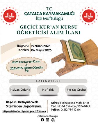 İlçe Müftülüğümüze bağlı olarak açılacak İhtiyaç Odaklı / Hafızlık / Hafızlık Destekleme ve 4-6 Yaş Grubu kurslar için kadrolu ve 4/B sözleşmeli öğreticilerin talebi karşılayamadığı durumlarda görevlendirilmek ve ek ders ücreti karşılığı çalıştırılmak üzere sözlü sınav ile Geçici Kur’an Kursu Öğreticisi alımı yapılacaktır.