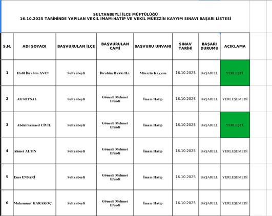 Sultanbeyli Müftülüğünce, 16 Eylül 2025  tarihinde yapılan Vekil İmam-Hatip ve Vekil Müezzin Kayyım Sınav Sonucu açıklanmış olup tabloda sunulmuştur.
