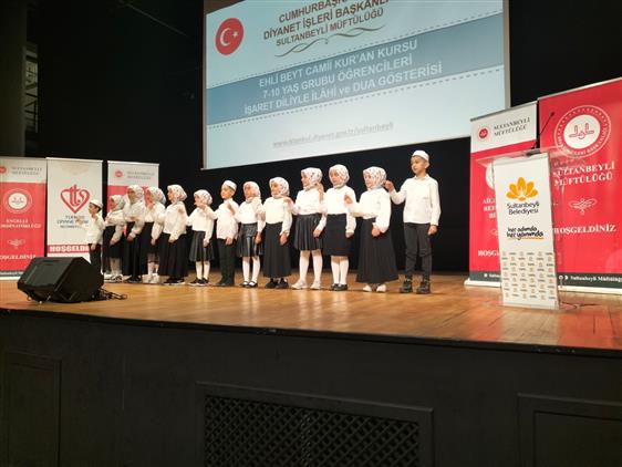 Program kapsamında Sultanbeyli Müftülüğüne bağlı Ehlibeyt Cami 7-10 Yaş Grubu Kur’an Kursu Öğrencileri sahne alarak işaret diliyle dua ve ilahiler okudu.